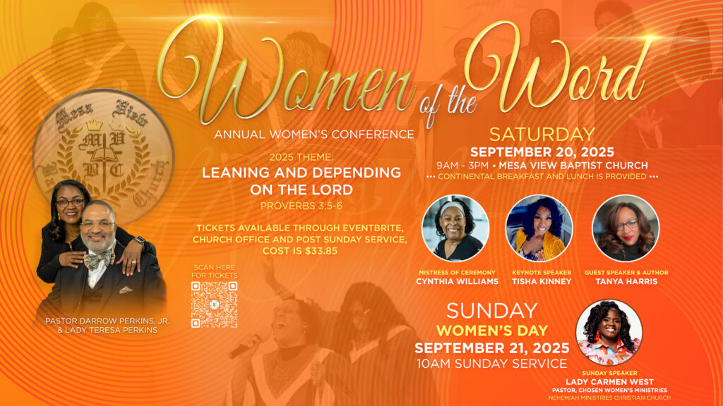 Join us for an unforgettable weekend of faith, fellowship, and inspiration at our annual Women’s Conference, held on Saturday, September 20, 2025, at 9:00 AM at Mesa View Baptist Church, cost is approximately $34. Continental breakfast and lunch will be provided.